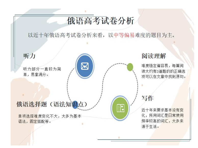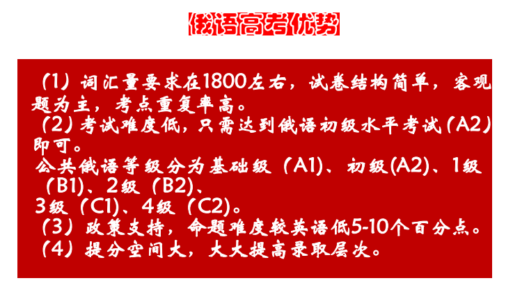 小语种高考中日语高考人数最多,其次就是俄语 考生。目前全国开设高考俄语的学校,大部分集中在 东北地区、山东省、河南省和江苏省。2020年全国使 用俄语参加高考的人数1万多人。考生人数较少,拥有 绝对优势。很多厌学英语或英语成绩较差的学生,通 过学习俄语参加高考成就了自己的大学梦、名校梦。 在中俄全面战略协作伙伴关系全面深化的背景 下,教育部将在扩大俄语复合人才培养规模、提高人 才培养质量上进一步努力,除高等学校之外,也将鼓 励有条件的地区在基础教育阶段学校,积极为有意愿 的学生学习俄语创造良好环境,加强整体规划,加快 形成大中小学合理衔接的俄语教学体系,为“一带一 路”国家战略提供有力的人才支撑。
